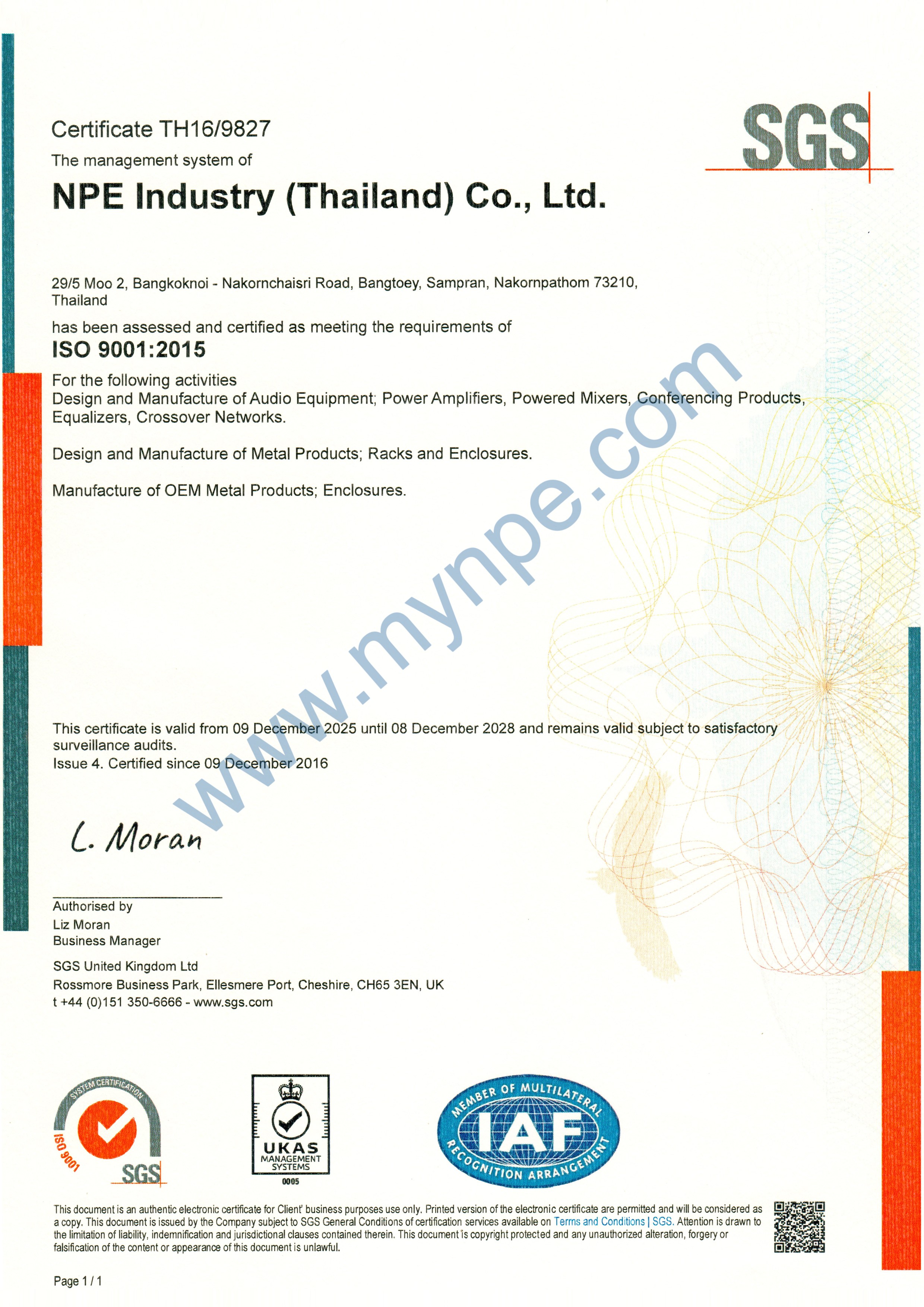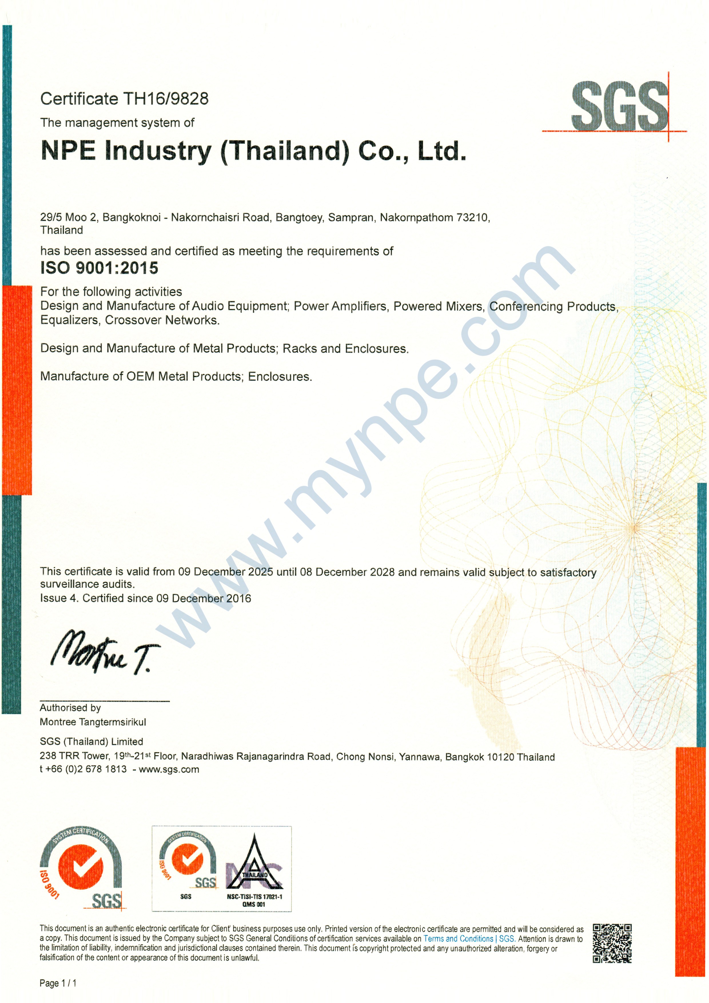ปี 2538 : สินค้าภายใต้แบรนด์ NPE เป็นที่รู้จักไปทั่วทุกภูมิภาคของประเทศไทย บริษัทจึงเริ่มขยายโรงงานผลิตสินค้า เเละก่อตั้ง บริษัท เอ็นพีอี อินดัสตรี (ไทยแลนด์) จำกัด ตั้งอยู่ที่ อ.สามพราน จ.นครปฐม เป็นโรงงาน ผลิตเครื่องเสียง ตู้ลำโพง งานโลหะ และตู้แร็คแบบครบวงจร มีทีมงานวิศวกรเพื่อการออกแบบ ติดตั้งระบบเสียงทั้งภายใน เเละภายนอกอาคาร บริษัทได้รับการแต่งตั้งจากเเบรนด์ PRO’SKIT ผู้ผลิตเครื่องมือเเบบครบวงจร จากประเทศไต้หวัน เเละแบรนด์ SHOW ผู้นำด้านสินค้าระบบเสียงตามสาย ระบบประกาศต่างๆแบบครบวงจร จากประเทศไต้หวัน ให้เป็นผู้นำเข้า เเละเป็นผู้แทนจำหน่ายสินค้าเพียงผู้เดียวในประเทศไทย